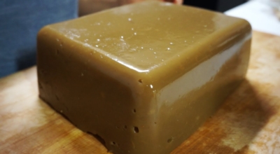 묵을 담을 용기에 물을 묻히고 물 묻힌 용기에 끓인 도토리묵 반죽 담기 묵이 용기에 달라붙지 않게 하기 위해 기름을 바르기도 하지만 간단한 방법이 있다고 하네요. 바로, 용기에 물을 묻기만 하면 된다고 해요. 뜸 들이고 젓는 궤도을 2~3회 반복하여 완료된 도토리묵 반죽을 물에 묻힌 용기에 담아줍니다. 그런 다음 이대로 굳히면 도토리묵이 완료된다고 해요. 이뤄진 도토리묵은 부서지지 않게 상온에서 그대로 식히면서 굳혀주세요. 이뤄진 도토리묵입니다.